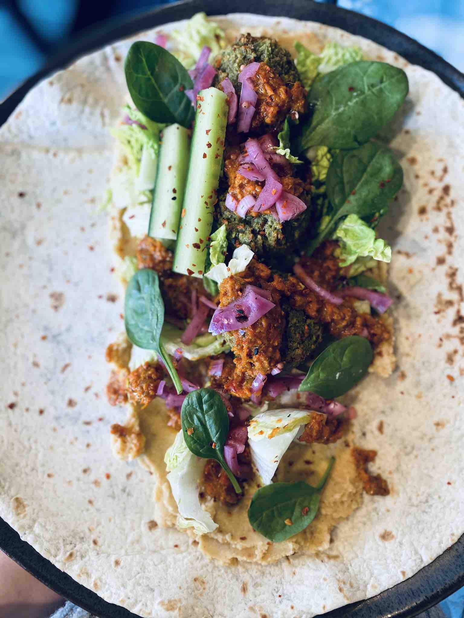 Dienstag, 14.2.23 – „´caue we love you – Wraps“ Knusprig saftige Erbsenfalafel mit yummy roasted garlic Tahini-Sauce, grünem Salat-Mix & leckerstem homemade and a little bit spicy green Humus