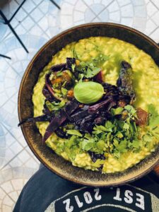 Dienstag, 23.4.24 – „For the Soul..“ Bowl – Cremig-milde Mais-Polenta & fruchtig mediterranes Ratatouille; dazu grünes Kräuter-Knobi-Chili-Würzöl und frische Petersilie