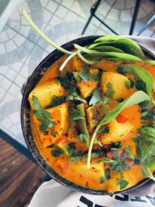 Donnerstag, 8.4.21 – Rotes Kokos Curry mit leckerem Gemüse & frischem Koriandergrün, dazu Basmatireis und fruity spicy Thai-Salat